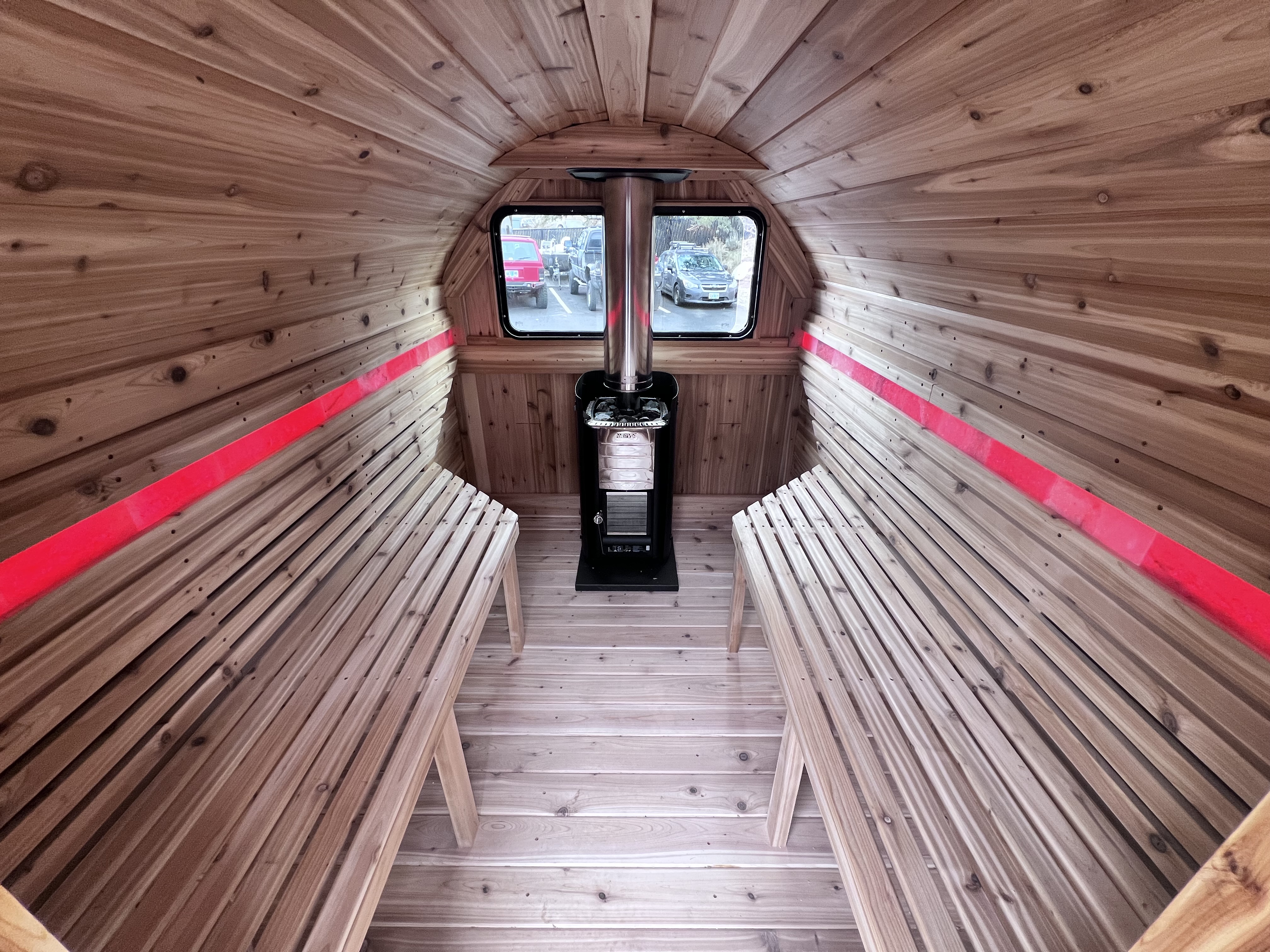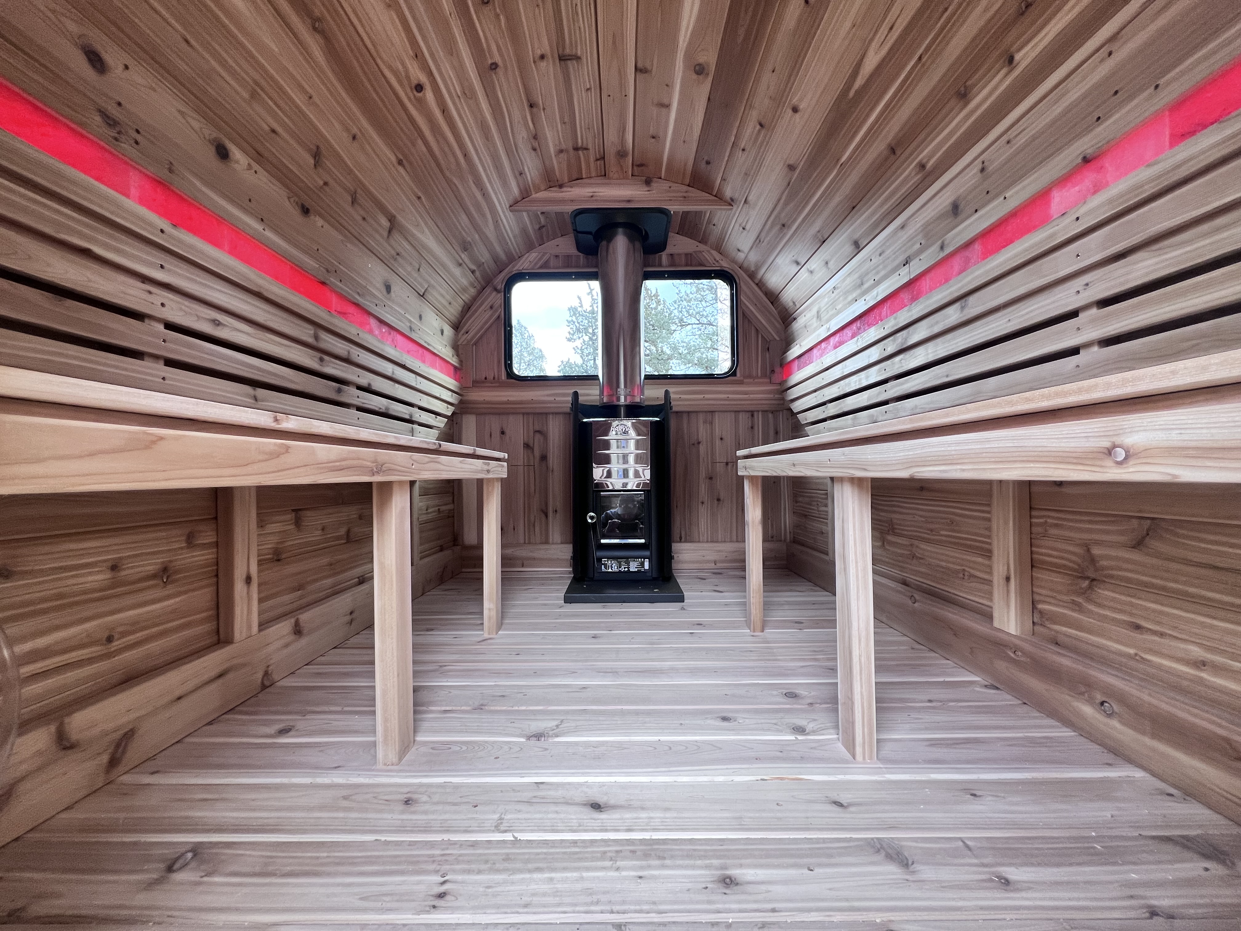 This 6x10 towable, salt-lined cedar sauna that fits 6-8 adults. Weighing only 1,500lbs, it's easy to tow with almost any vehicle and move by hand. Built with locally sourced Northwest Red Cedar, the sauna features adjustable Himalayan salt backlighting for a customizable ambiance. Each sauna also includes a covered porch with two bench seats, a Harvia M3 Finnish Sauna Stove with a steam rock basin, heated water tank, and Finnish sauna rocks, plus a new outdoor shower for added comfort.